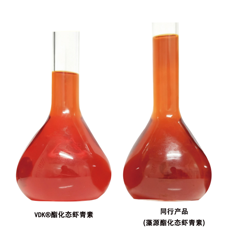 VDK®酯化态虾青素无任何悬浮杂质、沉淀或分层现象,纯粹、干净。