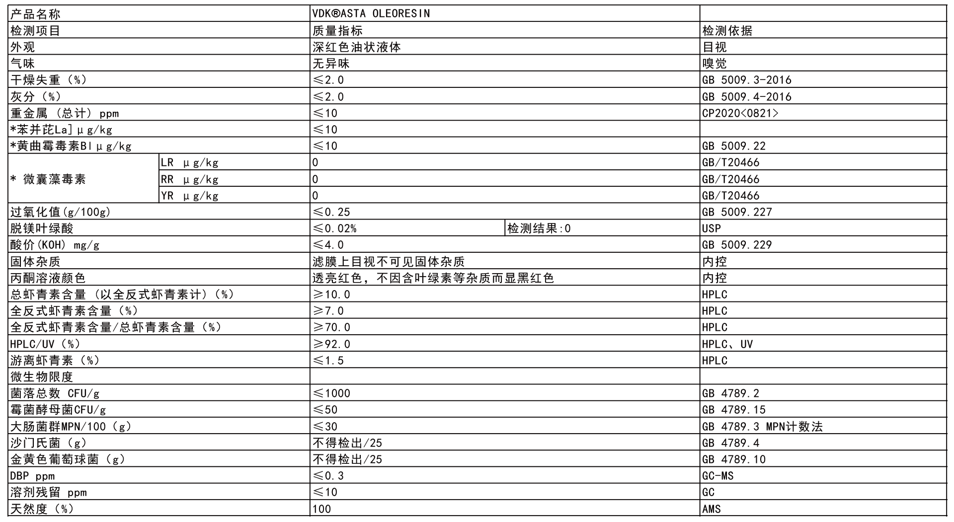 VDK® 酯化态虾青素含量规格(≥5.0%, ≥10.0%, ≥15.0%, ≥20.0%)及全反式占比 (≥70.0%, ≥75.0%, ≥80.0%) 可根据客户需求定制化生产